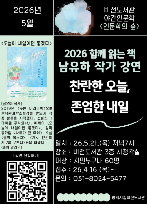 [뉴스앤톡] 평택시립 비전도서관은 오는 5월 21일 저녁 7시 남유하 작가를 초청하여 ‘찬란한 오늘, 존엄한 내일’을 주제로 야간 인문학 강연을 진행한다.