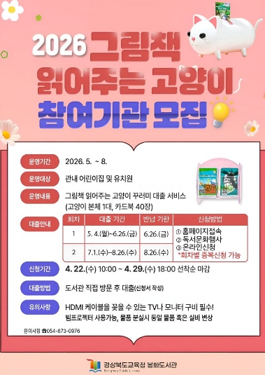 [뉴스앤톡] 경상북도교육청 봉화도서관(관장 이영숙)은 오는 5월부터 8월 까지 관내 어린이집과 유치원을 대상으로 디지털 독서 콘텐츠 '그림책 읽어주는 고양이'프로그램 참여기관을 선착순으로모집한다.