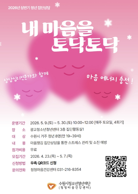 [뉴스앤톡] 수원시청소년청년재단 청청마음건강센터는 학업과 취업준비, 직장생활 등 경쟁 중심 환경으로 인해 심리적 소진을 겪는 관내 청년들을 대상으로, 오는 5월 7일까지 전문가가 참여하는 집단상담 프로그램 ‘내 마음을 토닥토닥’ 참가자를 모집한다고 밝혔다.