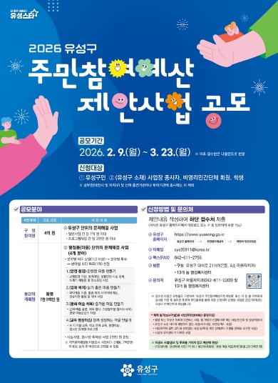 정용래 유성구청장은 “주민참여예산은 주민의 의견이 예산에 직접 반영되는 중요한 제도”라며 “생활 속 불편을 실질적으로 개선할 수 있는 다양한 제안이 접수되길 바란다”라고 말했다.
