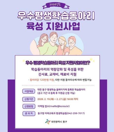 [뉴스앤톡] 대전 동구는 학습공동체 활성화를 위해 ‘2026년 우수 평생학습동아리 육성 지원사업’ 신청을 19일부터 오는 27일까지 접수한다고 밝혔다.