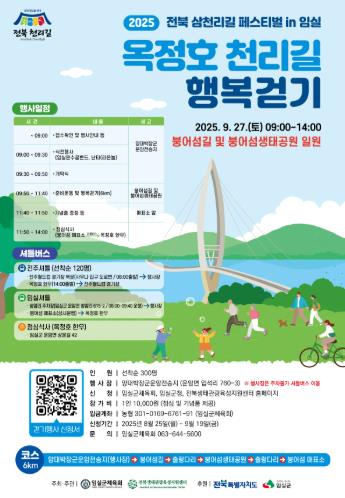 [뉴스앤톡] 임실군체육회와 전북생태관광육성지원센터 주관으로 오는 9월 27일 오전 9시 옥정호 붕어섬과 천리길 일원에서‘전북 삼천리길 페스티벌 in 임실 – 2025 옥정호 천리길 행복걷기’를 개최한다.