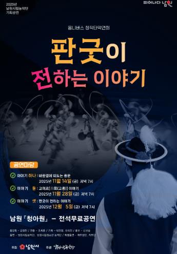 [뉴스앤톡] 남원시립농악단이 11월 14일, 11월 28일, 12월 5일 매회 금요일 오후 7시 남원 청아원 공연장에서 옴니버스 창작타악연희 ‘판굿이 전하는 이야기’를 선보인다.