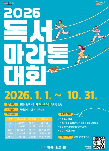 [뉴스앤톡] 광양시립도서관이 지역사회에 독서문화 확산을 위해 2026년 1월 1일부터 10월 31일까지 ‘2026 광양시 독서마라톤 대회’를 운영한다.