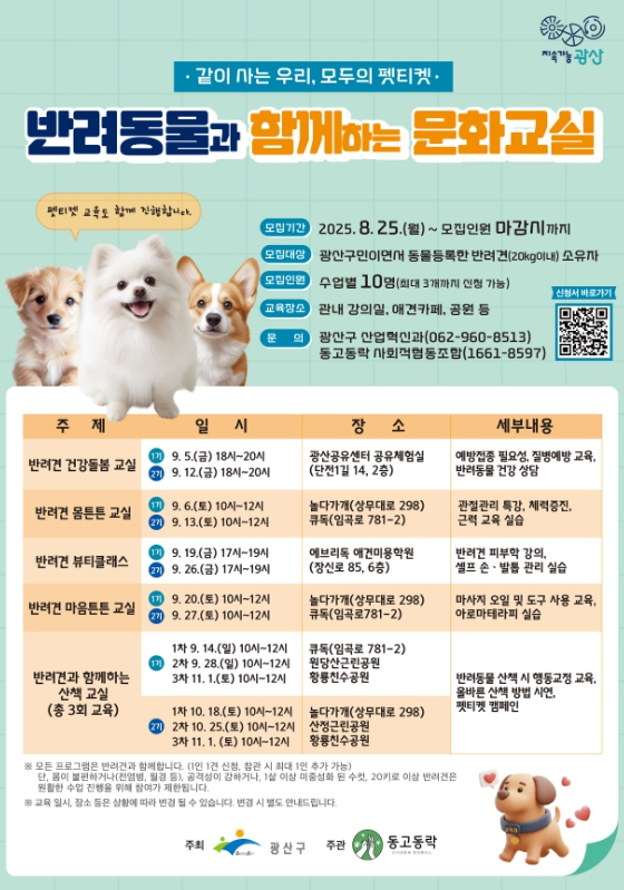 광산구 관계자는 “반려동물 문화교실은 단순히 교육을 넘어 반려인과 비반려인이 서로를 존중하고 공존하는 문화를 만드는 출발점”이라며 “서로 행복하고 안전한 반려 문화를 만드는 데 최선을 다하겠다”고 전했다.