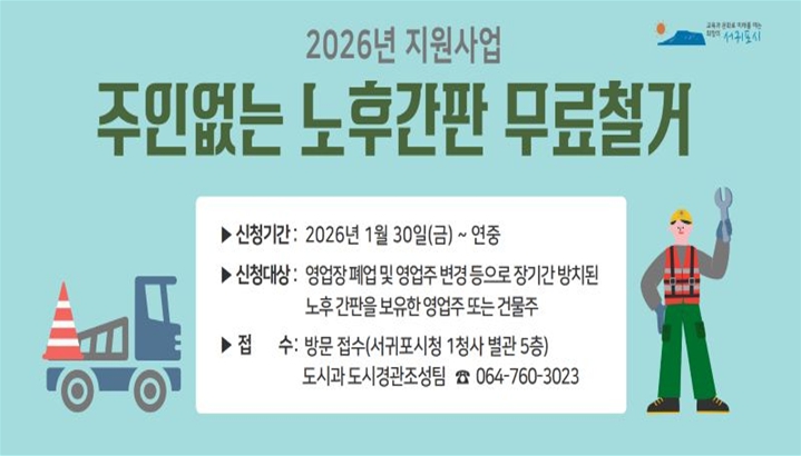 [뉴스앤톡] 서귀포시는 안전하고 쾌적한 도시경관 조성 및 소상공인의 경영 안정을 도모하기 위해 30일부터 ‘2026년 주인없는 노후간판 무료철거 지원사업’ 대상자를 연중 모집한다.