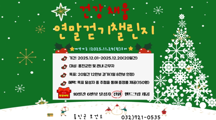 12월 걷기 챌린지와 관련해 자세한 사항은 옹진군보건소 건강증진과 로 문의하면 된다.