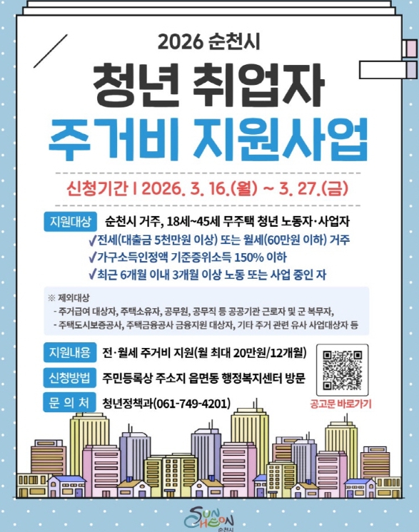 [뉴스앤톡] 순천시는 성실히 일하는 청년의 주거 안정과 경제적 자립 기반 마련을 위해'청년 취업자 주거비 지원사업' 대상자를 오는 27일까지 모집한다.