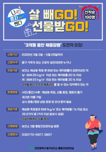 [뉴스앤톡] 인천 동구보건소는 주민 스스로 건강한 체중 관리를 할 수 있도록 돕는‘나 혼자 뺀다! 살빼GO! 선물받GO!’프로그램 참여자를 모집한다고 밝혔다.
