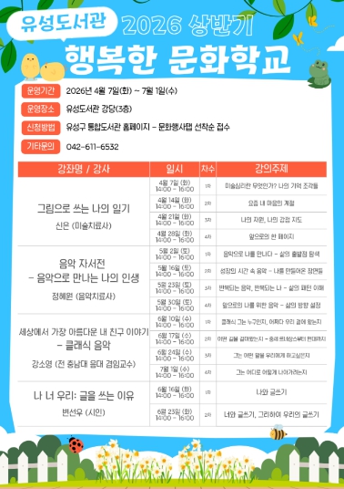 [뉴스앤톡] 대전 유성구는 4월부터 7월까지 주민의 문화 향유 기회를 확대하고 정서적 치유를 지원하기 위한 ‘2026년 상반기 행복한 문화학교’를 운영한다.