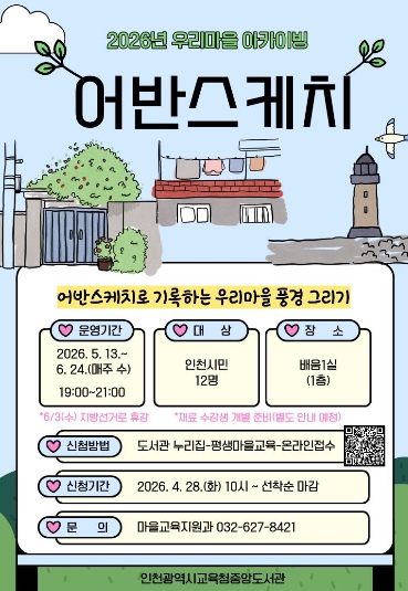 [뉴스앤톡] 인천광역시교육청중앙도서관은 2026년도 마을교육 아카이빙 사업의 일환으로, 5월 13일부터 ‘우리 마을 아카이빙, 어반스케치’ 프로그램을 운영한다.