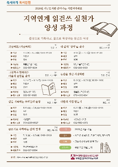 서구도서관 관계자는 “이번 지역기관 연계 사업을 통해 ‘독서국가, 독서인천’실현의 기반이 되어 시민의 독서활동을 생활화하고, 지역사회 중심의 지속 가능한 독서공동체 형성에 기여하길 기대한다”고 말했다.