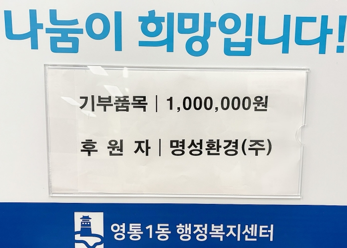 | ▲ 명성환경(주), 수원시 영통구 영통1동에 100만원 기탁 |