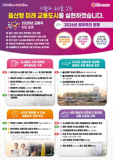 2026년 교통 분야 정책 방향은 ‘사람과 도시를 잇는 울산형 미래교통도시 실현’을 목표로 △막히지 않는 일상, 초광역권 교통도시 구축 △울산사람이 자부심을 느낄 수 있는 교통 환경 조성에 주력한다.