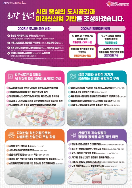 [뉴스앤톡] 울산시가 ‘최강 울산!’ 완성을 위한 시민 중심의 도시공간 조성과 미래 신산업 기반 구축을 목표로 2026년 도시 분야 정책을 추진한다.