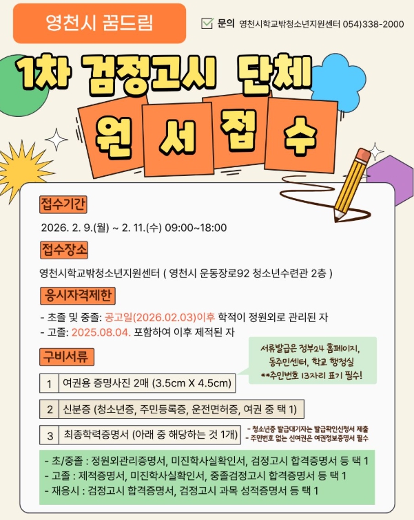 [뉴스앤톡] 영천시학교밖청소년지원센터는 학교 밖 청소년의 학력 취득을 지원하기 위해, 오는 4월 4일 실시 예정인 2026년 제1회 초·중·고등학교 졸업학력 검정고시와 관련해 원서접수 대행 서비스를 9일부터 11일까지 운영한다고 밝혔다.
