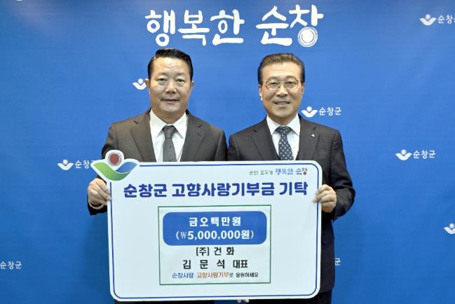 [뉴스앤톡] 순창군은 15일 ㈜건화 김문석 대표이사가 순창군에 고향사랑기부금 500만원을 기탁했다고 밝혔다.