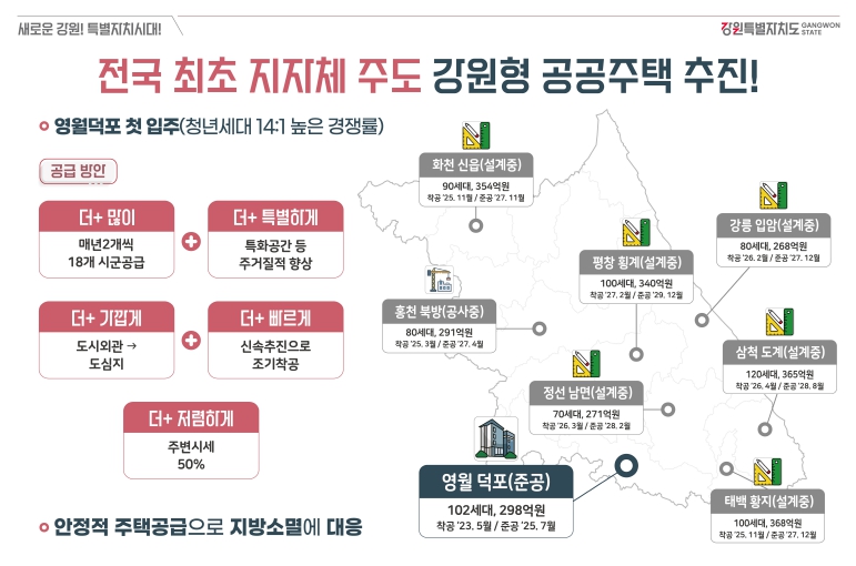- 현재 도내에서는 8개 시군(영월, 홍천, 태백, 정선, 강릉, 화천, 삼척, 평창)에서 총 742세대 규모의 사업이 추진 중이며, 이 중 제1호 사업인 영월 덕포지구 강원형 공공주택이 최근 준공을 완료하고 입주를 마쳤다.