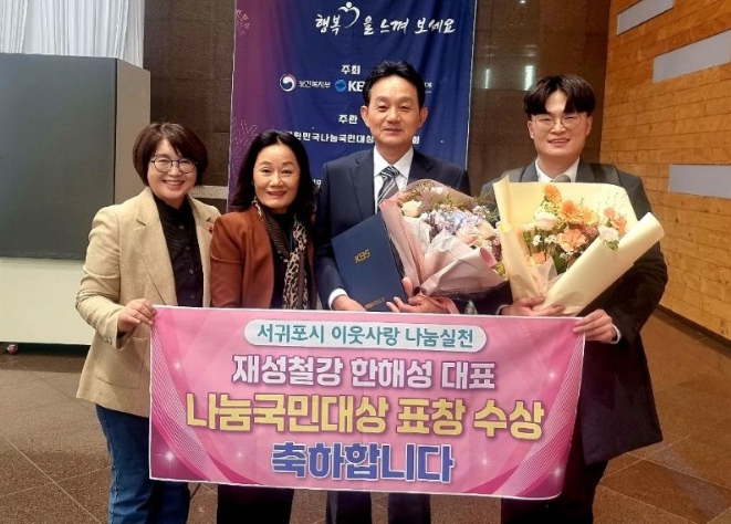 [뉴스앤톡] 서귀포시는 재성철강 한해성 대표가 2014년부터 11년간 이웃사랑을 적극 실천해 온 공로를 인정받아 11월 6일 서울 KBS 본사에서 열린 ‘2025년 나눔국민대상 시상식’에서 민간단체장 대표수상자로 표창(KBS사장 표창)을 수상했다고 밝혔다.