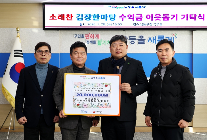 [뉴스앤톡] 인천시 남동구는 최근 (사)인천식품제조연합 남동구협회로부터 ‘2025년 남동구 소래찬 김장한마당’ 판매 수익금 총 2천만 원을 기탁받았다고 30일 밝혔다.