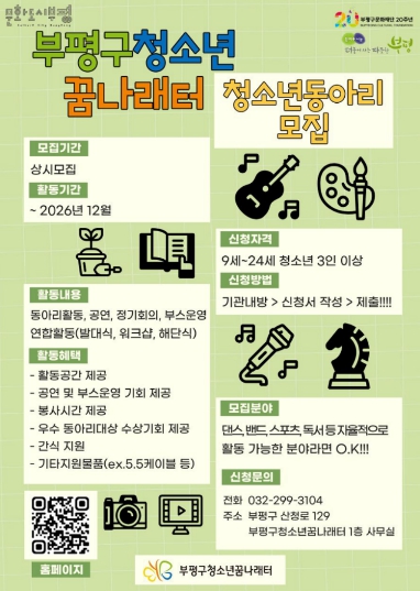 [뉴스앤톡] 부평구청소년꿈나래터는 ‘2026년도 청소년자율동아리’를 상시 모집한다고 23일 밝혔다.