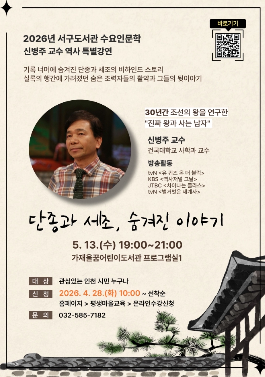 [뉴스앤톡] 인천광역시교육청서구도서관은 4월 28일부터 ‘단종과 세조, 숨겨진 이야기’ 특별 강연 참여자를 모집한다.