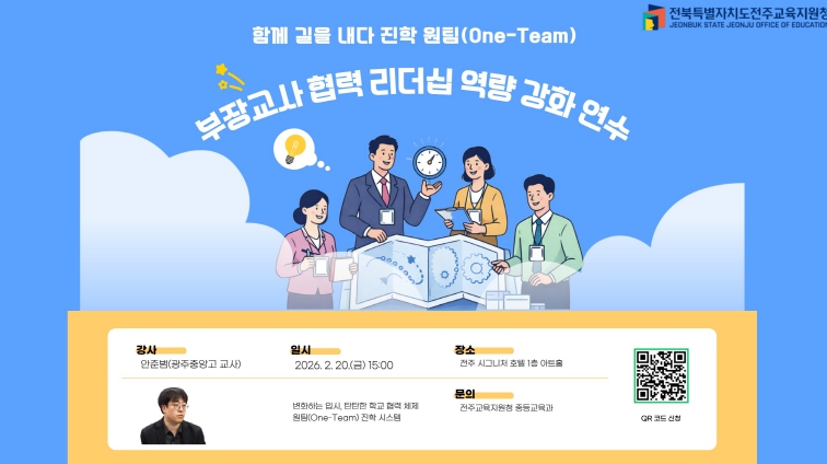 [뉴스앤톡] 전북특별자치도전주교육지원청은 오는 20일 전주시그니처호텔에서 관내 고교 부장 교사를 대상으로 ‘진학 원팀(One-Team) 부장교사 협력 리더십 역량 강화 연수’를 운영한다고 10일 밝혔다.