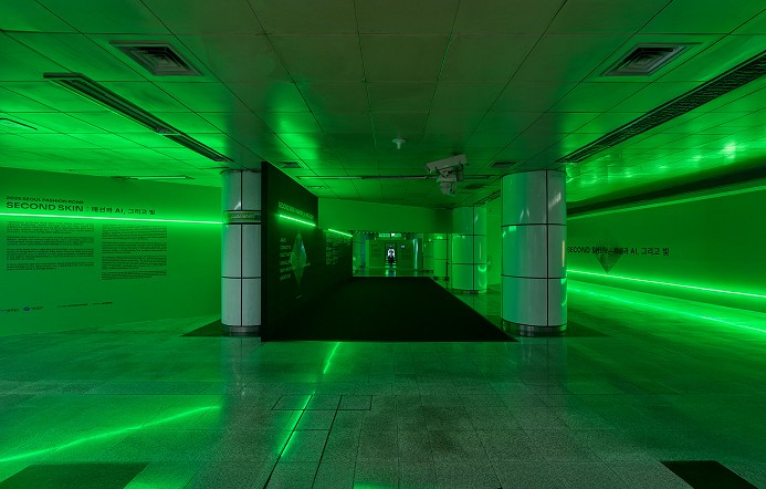 이번 전시는 150m 길이의 미사용 지하 통로를 활용해 관람객의 몸에 빛으로 의상을 투사하는 방식으로 진행됐다. 관람객은 실제 옷이 아닌 ‘빛의 패턴과 실루엣’을 몸에 입으며 패션을 직접 체험하는 새로운 전시 방식을 경험했다. 또한, 빛과 함께 동대문 일대의 거리 소음, 지하철 기계음과 테크노 비트가 결합된 사운드는 몰입형 환경을 배가시켰다.