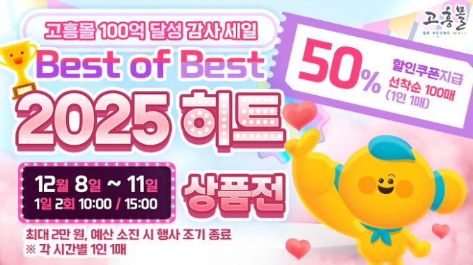 [뉴스앤톡] 고흥군은 직영 온라인 농수축특산물 쇼핑몰 ‘고흥몰’이 누적 매출 100억 원 돌파를 기념해 오는 1월 8일부터 11일까지 ‘100억 달성 감사 세일–2025 Best of Best’ 기획전을 진행한다고 밝혔다.
