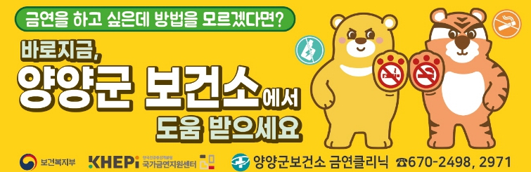 한편, 양양군보건소 금연클리닉은 금연을 희망하는 지역 주민이라면 누구나 연중 평일 오전 9시부터 오후 6시까지 참여할 수 있으며, 자세한 사항은 양양군보건소 금연클리닉을 통해 안내받을 수 있다.