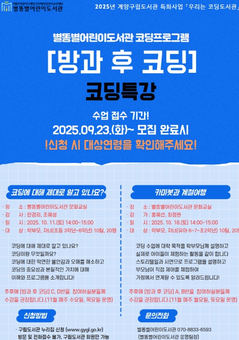 [뉴스앤톡] 인천 계양구립별똥별어린이도서관은 2025년부터 실시된 초·중등학교 코딩교육 의무화에 따라 지역 아동들의 디지털 역량 강화를 위해 10월부터 코딩 특화사업 ‘방과 후 코딩’을 운영한다고 밝혔다.