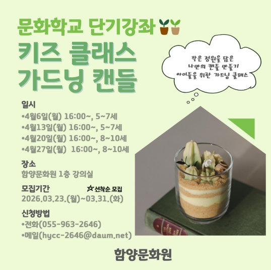 [뉴스앤톡] 함양문화원(원장 정상기)은 군민들에게 문화예술 체험 기회를 제공하기 위해 오는 4월 단기강좌 '글라스아트 클래스'와 '키즈 캔들 클래스'를 운영한다.