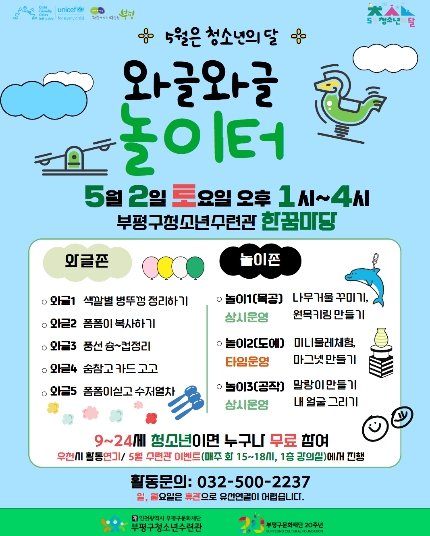 [뉴스앤톡] 부평구청소년수련관은 오는 5월 2일 청소년 체험 행사 ‘와글와글 놀이터’를 운영한다고 밝혔다.