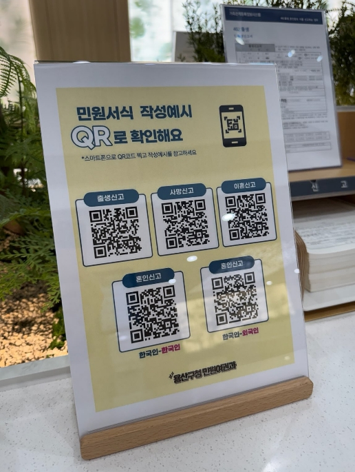 정보무늬(QR코드)로 작성 예시를 확인할 수 있는 민원 서식은 ▲출생신고서 ▲혼인신고서 ▲사망신고서 ▲이혼신고서 총 4종이다. 정보무늬(QR코드)는 거치대를 활용해 안내하는 한편, 서식 상단에도 삽입‧인쇄했다. 구 누리집에서는 종합민원 하단 메뉴로 마련했다.