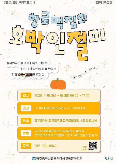 [뉴스앤톡] 광주시교육청학생교육문화회관은 오는 18~19일 회관 내 청소년 전용 공간 ‘항로1216’에서 ‘호박 인절미 창작 챌린지’를 운영한다.