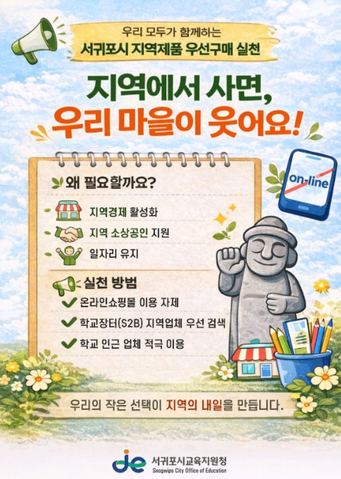 서귀포시교육지원청은 ‘우리동네꺼, 우리가 사게마씀!’라는 구호 아래 교육기관의 구매력을 지역에 환원해 소상공인을 지원하고 상반기 신속 집행과 연계해 지역 소비를 촉진함으로써 지역경제 활성화에 기여하고자 한다.