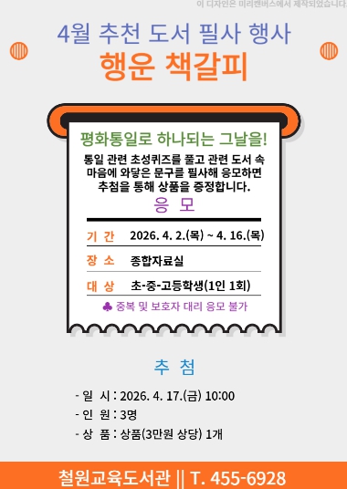 [뉴스앤톡] 철원교육도서관(관장 김민서)은 4월부터 11월까지 종합자료실에서 지역 초·중·고 학생을 대상으로 추천 도서 필사 행사 ‘행운 책갈피’를 8회 운영한다.