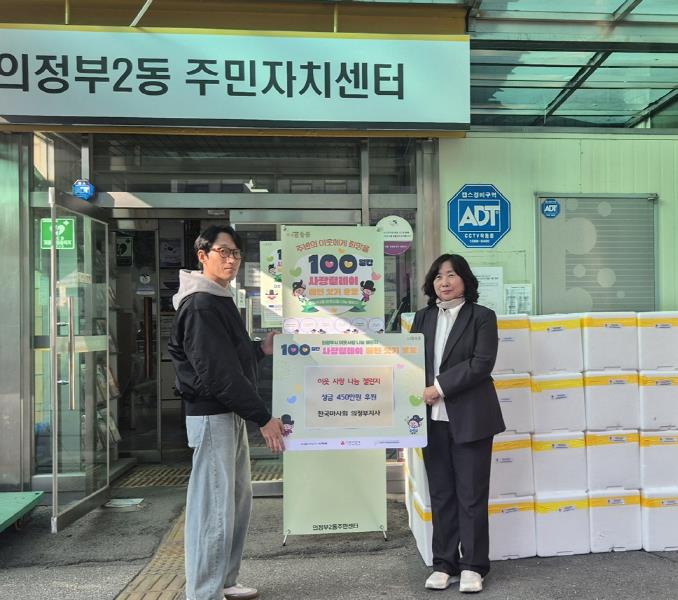 [뉴스앤톡] 의정부시 의정부2동주민센터는 11월 12일 한국마사회 의정부지사가 ‘100일간 사랑릴레이 배턴 잇기’에 동참해 성금 450만 원을 기부했다고 밝혔다.