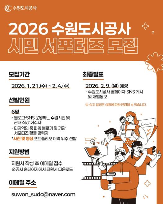[뉴스앤톡] 수원도시공사가 21일부터 다음 달 4일까지 2026년도 제8기 시민 서포터즈를 모집한다.