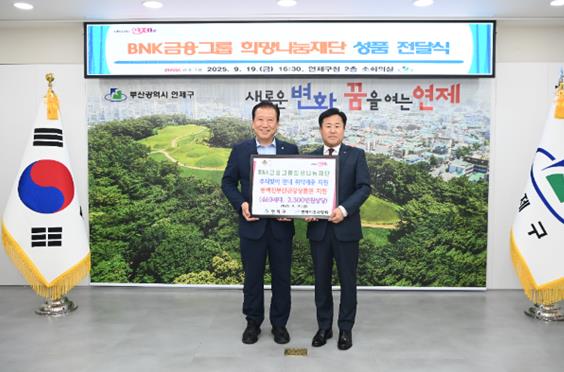 [뉴스앤톡] 연제구는 9월 19일 BNK금융그룹 희망나눔재단으로부터 저소득 취약계층을 위한 동백전 선불카드(부산지역화폐 2,300만 원 상당)를 기탁받았다.