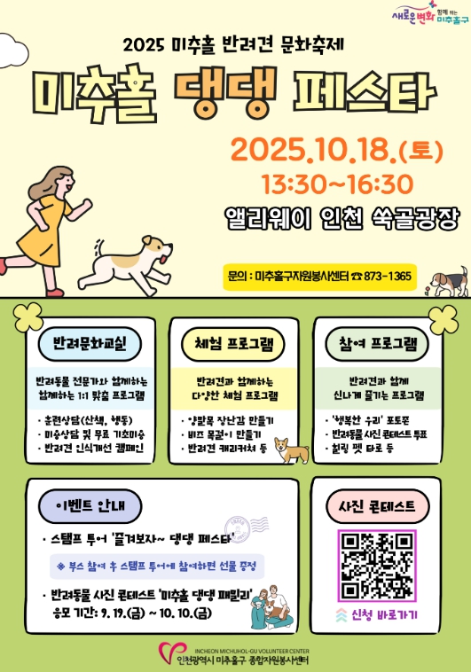 [뉴스앤톡] 인천 미추홀구종합자원봉사센터는 오는 10월 18일 앨리웨이 인천 쑥골광장에서 ‘2025년 미추홀 반려견 문화축제 미추홀 댕댕 페스타’를 개최한다.