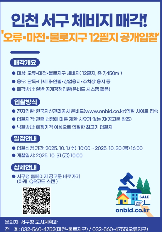 [뉴스앤톡] 인천 서구는 오는 10월 1일부터 30일까지 오류, 마전, 불로지구 토지구획정리사업구역 내 체비지 12필지를 일반 공개경쟁 입찰(전자입찰) 방식으로 매각한다고 밝혔다.