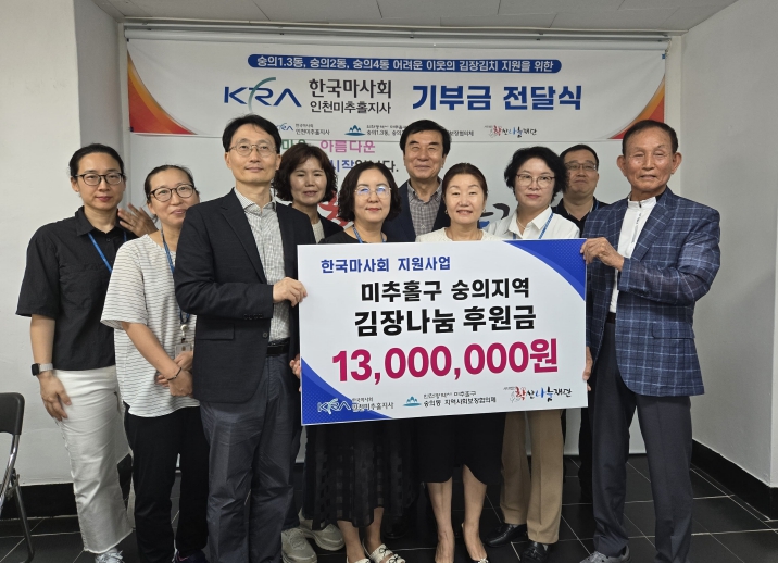 [뉴스앤톡] 한국마사회 인천미추홀지사(지사장 조영진)는 미추홀구 숭의1·3동, 숭의2동, 숭의4동 일대 취약계층을 지원하기 위해 김장 나눔 후원금 1,300만 원을 학산나눔재단에 전달했다고 23일 밝혔다.