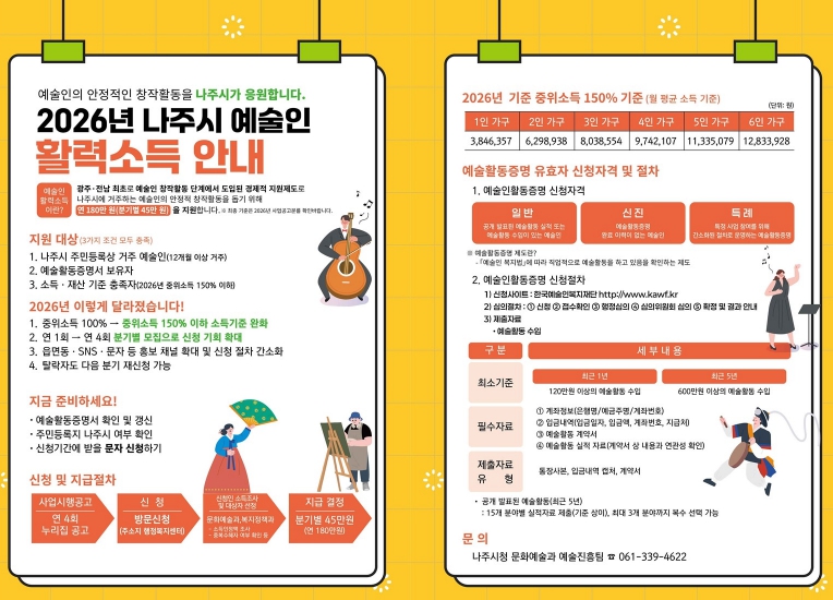 지원 대상은 공고일 기준(2026. 4. 14.) 나주시에 12개월 이상 주민등록을 두고 실제 거주 중인 예술인으로 한국예술인복지재단의 예술활동증명서를 보유하고 중위소득 150% 이하 기준을 충족해야 한다.