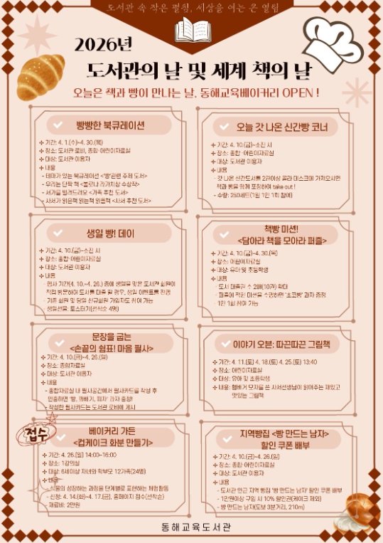 [뉴스앤톡] 동해교육도서관은 4월 12일 도서관의 날과 4월 23일 세계 책의 날을 맞아 ‘오늘은 책과 빵이 만나는 날, 동해교육베이커리 오픈(OPEN)!’을 주제로 지역주민과 함께하는 독서문화 행사를 운영한다.