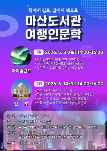 [뉴스앤톡] 김포시 마산도서관이 오는 5월 31일과 6월 14일 오후 2시부터 4시까지 다목적실에서 여행 인문학 강연 ‘책에서 길로, 길에서 책으로’를 운영한다.