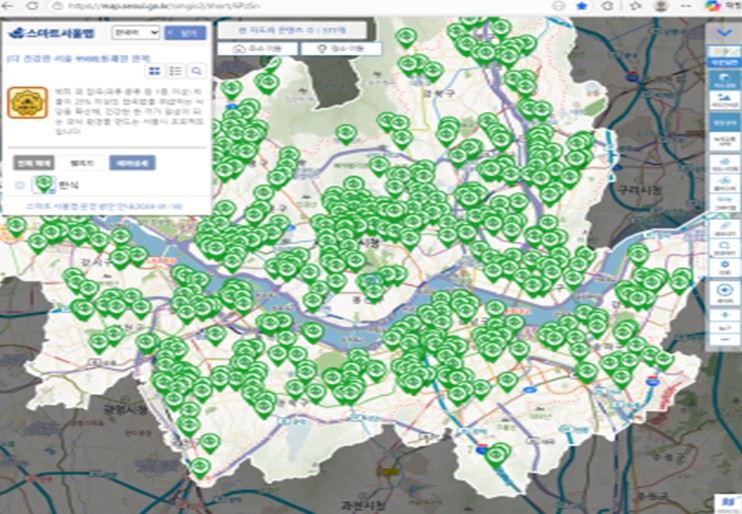 | ▲ ‘통쾌한 한끼’ 인증 식당 정보 및 위치 표출 사이트(스마트서울맵) |
