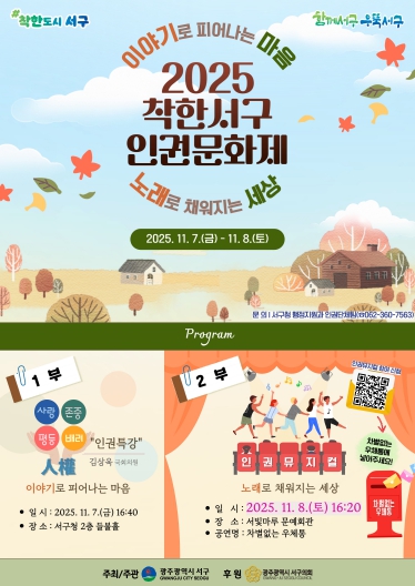 [뉴스앤톡] 광주광역시 서구가 주민 참여 기반 인권문화 정착에 박차를 가한다. 서구는 오는 7일과 8일 이틀간 ‘이야기로 피어나는 마음, 노래로 채워지는 세상’을 주제로 ‘2025 착한서구 인권문화제’를 개최한다.