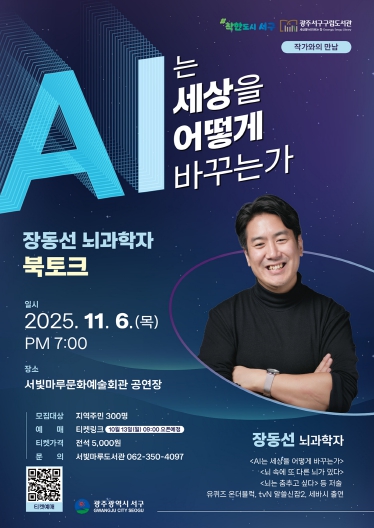 [뉴스앤톡] 광주광역시 서구는 오는 6일 오후 7시 서빛마루문화예술회관에서 대한민국 대표 뇌과학자인 장동선 박사를 초청해 ‘특별 북토크’를 개최한다. 이번 북토크는 ‘AI는 세상을 어떻게 바꾸는가’라는 주제로 1부 강연과 2부 대담 프로그램으로 진행된다.