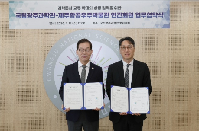 [뉴스앤톡] 제주국제자유도시개발센터에서 운영하는 제주항공우주박물관은 4월 8일 국립광주과학관 중회의실에서 국립광주과학관과과학문화 확산을 위한 업무협약을 체결했다고 밝혔다. 협약식에는 김석주 제주항공우주박물관장과 국립광주과학관 이정구 관장 등 관계자가 참석했다.
